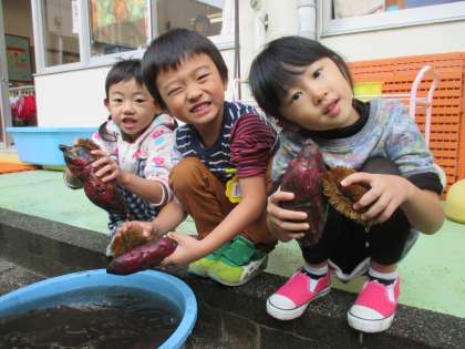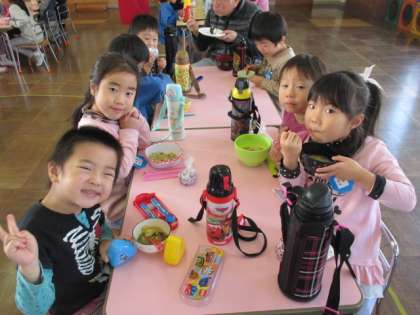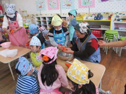 できあがったさつま汁は、みんなで遊戯室で食べました。「おいしいね」「このさつまいもは僕が洗ったよ」「これはわたしが切った大根だ」と話しながら、おいしそうに食べていました。何回も「おかわり」の声が聞こえてきて、楽しいさつま汁パーティになりました。