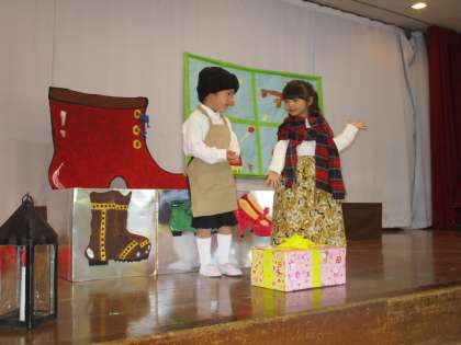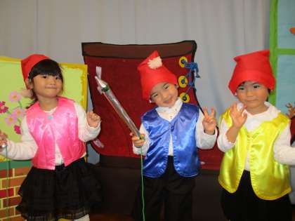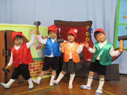 グリム童話「こびとのくつや」のお話が大好きになりました。子供たちは、『おじいさんとおばあさんが寝ている時に靴を作っていたんだね』『こびとさんってどこから出てくるのかな』など話しながら、お話の世界を楽しんでいます。今週の「なかよし発表会」で、年少児はこびとのくつやの劇ごっこをすることにしました。おじいさん役・おばあさん役・こびと役になりきって楽しんでいます。踊ったり歌ったりする(たんぽぽ劇団)を見に来てくださいね。