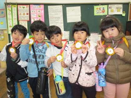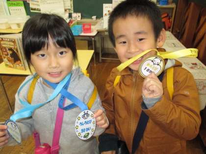 年長組の子供たちは、毎日縄跳びをして楽しく体を動かして遊んでいます。ここ最近では、軽やかに跳ぶことができるようになった子供たちが多くなり、回数も増えてきました。「次は、50回メダルをもらうぞ」「悔しい、もう少しで100回だったのに」と、自分の目標を決めて頑張っています。友達同士で刺激し合い、目標を達成する喜びも味わっています。