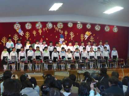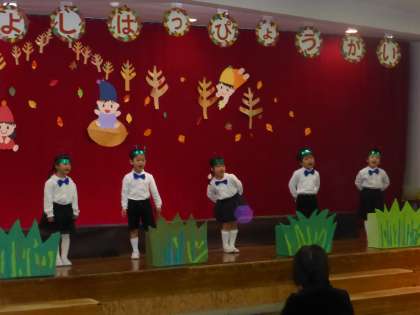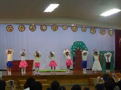 今日は、なかよし発表会がありました。オープニングは全員で「もみじ」と「ドレミのうた」を歌いました。プログラム2番からは、各年齢ごとに歌と合奏を、プログラム5番からは年齢ごとの劇遊びを発表しました。日頃から、いろいろなことに挑戦したりごっこ遊びをしたりしている姿を友達と一緒に楽しく表現していました。