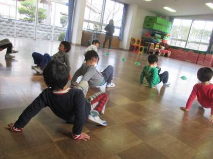 始めにストレッチをしてから、犬やクマ、ペンギンなどいろいろな動物になって歩いたり、仲間集めゲームをしたりして遊びました。