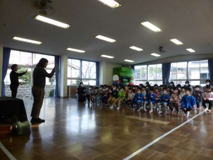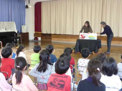 今日は、おはなし宅配便の方が幼稚園に来てくださり、「よいしょ よいしょ」「まどからのおくりもの」「ハリーのセーター」「おおきなかぶ」の絵本や紙芝居を読み聞かせしてもらいました。大きな絵本に子供たちは、興味をもちながら話しを聞いていました。「よいしょよいしょの本は、大きな人参が出てきたり、サンタさんが出てきたりした所がおもしろかったな」「サンタさんがプレゼント渡すの間違えていたね」など、おもしろかった所や楽しかった場面を友達同士で話をしていました。