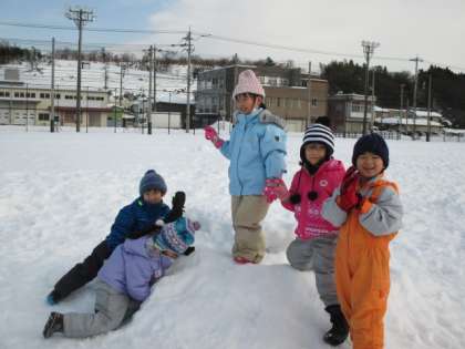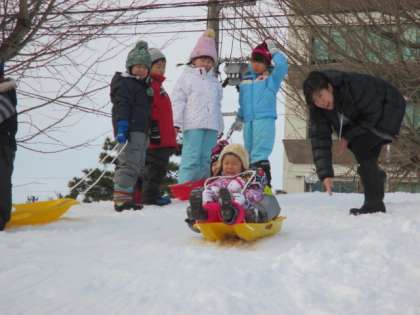 雪がたくさん積もり、空は青空。今日は絶好のソリ遊びの日になりましたね。子供たちは「早く外に行きた〜い!」とスキーウェアーに着替え、元気にグランドへ駆け出していきました。築山に着くと、さっそくソリ遊び!!スピードが出てくると、「キャー」と歓声をあげ、何度も何度も滑っていました。また広いグランドを走り回ったり、雪の上に寝そべったり、雪だるまを作ったりと、子供たちは雪の感触を思いきり楽しんでいました。またたくさん遊ぼうね。