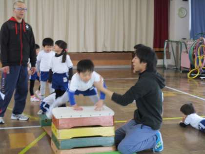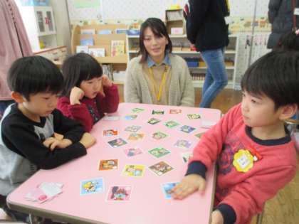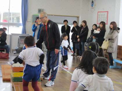 今日は、保育参観でした。日頃の遊びや体操教室の様子をみてもらいました。体操教室ではお馬さんパカパカをして跳び箱に親しんでから開脚跳びをしました。ドンジャンケンやカルタ取りなど、友達と誘い合ったり競い合ったりして一緒に遊ぶ姿がとても楽しそうでした。どの子もお母さんに見てもらう嬉しさで、はりきっていたようです。