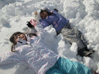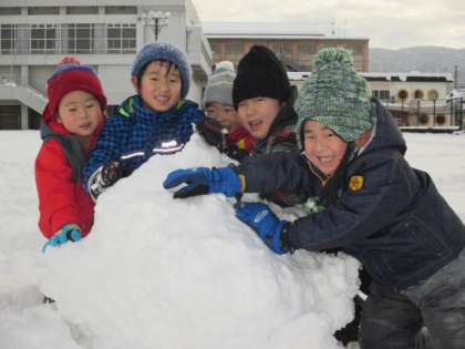 グランドにまたたくさんの雪が積もり、子供たちは大喜び!まだ誰も歩いていない膝まで積もった新雪の中を、元気に歩いていきました。「ねーねー雪だるま作ろう!」と雪玉を転がすと、どんどん大きくなり、みんなで力を合わせて「ぐっぐっ」と雪の音を楽しみながら、前進していきました。そしてあちらこちらに大きな雪玉が完成。重くて雪玉を乗せることができませんでしたが、子供たちは満足そうでした。また、ソリ遊びをしたり、雪の上に大の字に寝転んだり、雪合戦をしたりと、今日も雪遊びを思いきり楽しみました。