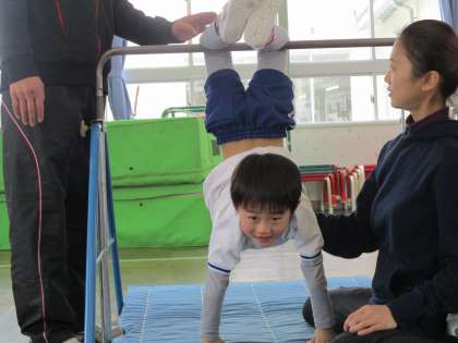 春のころ、初めて鉄棒に触れたころは少し怖かった子供たちですが「今日は鉄棒だって!うれしいな」と楽しみにするようになりました。足抜きまわり・腰抜き回り・つばめから前回り・・・こうもりみたいにさかさまになっておりることもできるようになってきました。ギュッて腕を縮めて1,2,3、・・と20までもがんばることもできます。