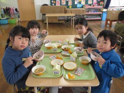 今年度もわずかとなり、年長さんともお別れ。先週から「お別れ交流週間」として、みんなで一緒に散歩に出かけたり、お部屋に遊びに行ったりして楽しんでいます。昨日から交流給食が始まりました。ひまわり組さんが「くじびきをしまーす!」と各クラスをまわってくれ、どのクラスで給食を食べるのか決めます。「やったー!ひまわりだ!○○ちゃんと一緒だ!」と毎日くじ引きを楽しみにしている子供たち。給食の時間になると、年長さんは年中さんや年少さんに優しく声をかけてくれ、みんなでたくさん会話をして楽しく食事をしています。給食が終わると、ブロックをしたり、オセロをしたり、絵本を一緒に見たりして、楽しく遊んでいる子供たちです。明日はどのお部屋になるかな?楽しい思い出をたくさん作ろうね!