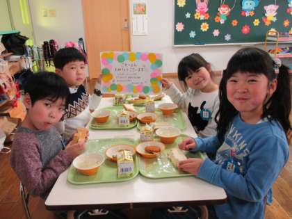 給食の配膳をしていると、給食室の調理員の方から「修了おめでとう」と手紙が入っていました。子供たちに見せると「お手紙うれしいね」「小学校に行ってもいっぱい食べようね」と話をしていました。