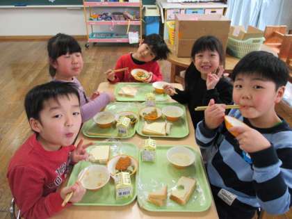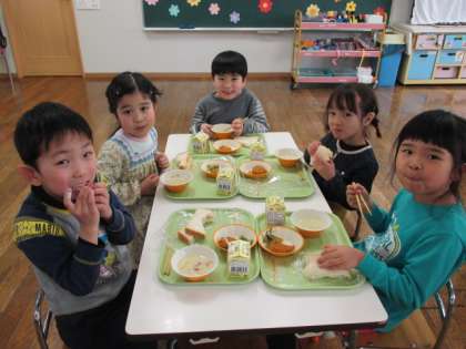 幼稚園で食べる給食は今日で最後でした。3歳のころは、苦手な食べ物もあった子もいましたが、今ではピカピカに食べて、おかわりもいっぱいできるようになりました。
