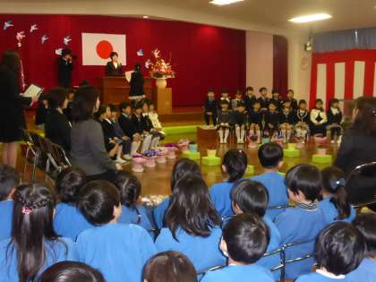 30人のかわいい年長さんが、今日、楽しく過ごした大沢野幼稚園を巣立っていきました。名前を呼ばれて修了証書を一人ひとり園長先生からもらって、保護者の方のところまで歩いていくときの姿がとてもかわいく「ありがとう!」「おめでとう」と親子で見つめあう姿も心熱くなるシーンでした。