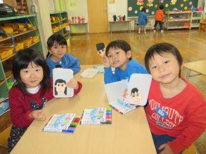 今日は、自分の顔を画用紙で作って遊びました。鉛筆で顔の輪郭や髪の毛を描いて、はさみで切り、のりで貼ったら顔を描いて完成です。子供たちの顔は、誕生表になります。お楽しみに!