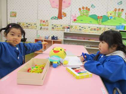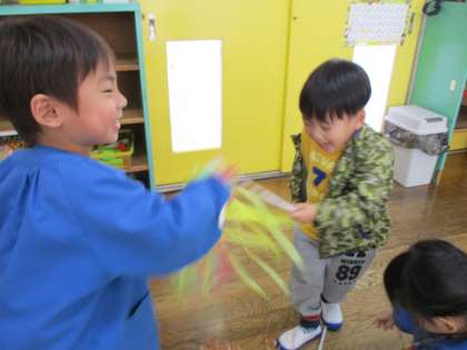 入園して1週間がたちました。身の回りの物の片付ける場所も覚え、自分で行うたくましい姿が見えてきました。ウルトラマンの手遊びでは、怪獣やウルトラマンになって元気に飛んだりもしています。友達とままごと遊びをしたり電車で遊んだりと笑顔がいっぱいのたんぽぽ組のみんな、また月曜日からたくさん遊びましょうね!