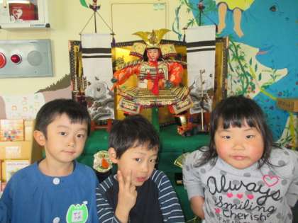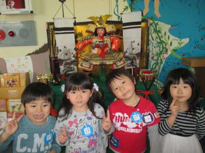 5月5日は端午の節句ですね。みんなで玄関に五月人形を飾りました。「うちにも飾ってあるよ!」「わー大きい!」「刀だ!かっこいい」と子供たちは興味深く飾りつけをしていました。子供たちが元気に大きく育ちますように…子供の日の集いには、由来を聞いたり、ゲームをしたりして楽しみたいと思います。
