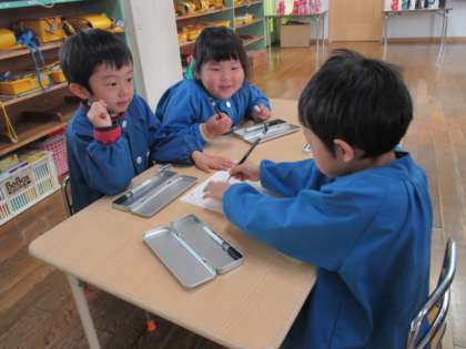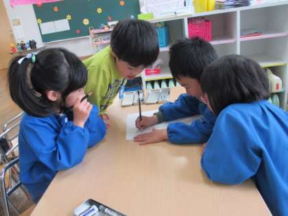 5月12日はみんなが楽しみにしている親子遠足。バスの中で楽しいことをしていきたいね!という話から、何をしたいかみんなで話し合い、クイズをすることにしました。各グループごとに問題を考え、1人1問ずつクイズを出します。「これむずかしいかな」「あっ!その問題いいね」と子供たちは一生懸命問題を考え、誰がどの問題をいうか決めて練習をしています。みんなに楽しんでもらおうと、子供たちは張り切っていますよ。たんぽぽさん、ひまわりさん、お楽しみに…