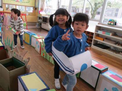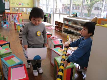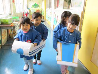 たんぽぽ組さんがトイレに行く時にいつも電車のようにつながって移動しています。「出発しまーす」「たんぽぽ組に到着です」と言ったり、手で車輪が回る様子を表現したりしていたので、段ボール箱で電車をつくりました。早速、たんぽぽ組さんが乗り、「新幹線です」「特急です」と走って遊んでいると、ひまわり組さんが「線路つくってあげる」と言って段ボール箱で線路をつくってくれたり、踏切をつくってくれたりしました。たんぽぽ組さんの遊びに、ひまわり組さんのアイディアがプラスされ、どんどんと楽しい遊びになっています。