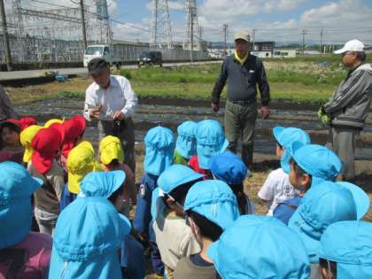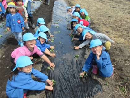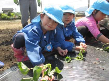 今日は、地域の方にサツマイモの植え方を教えてもらいながらみんなで苗植えをしてきました。苗を寝かせて植え、泥の布団をかけました。年長組は、最後に水やりもしてきました。秋には、おいしいサツマイモが収穫できることを楽しみにしていました。
