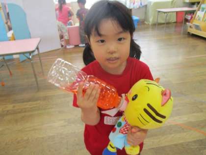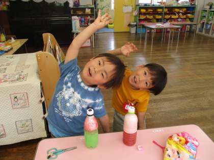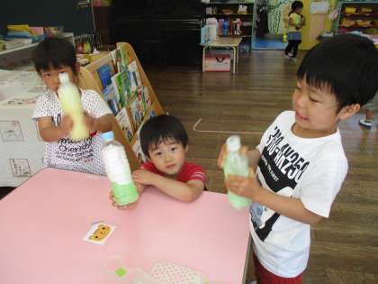 「ぶどう味」「オレンジ味」と好きな色の色水をつくってジュースづくりが続いています。ペットボトルを振って「しゅわしゅわジュースになったよ」といっていましたが、「すぐに泡が消える。消えなかったらいいな」と少し残念そうでした。そこで、石鹸を削った粉を入れると、子供たちの目がキラキラになって「しゅわしゅわだ」と大喜び。炭酸ジュースができました。