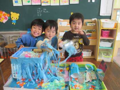 お休み中水族館に遊びに行ってきたようで、月曜日からいろいろな魚の話が始まり、「キラキラの魚つくりたい」「魚が泳ぐところつくりたい」と水族館づくりが始まりました。これからどんな魚をつくっていくのか楽しみです!