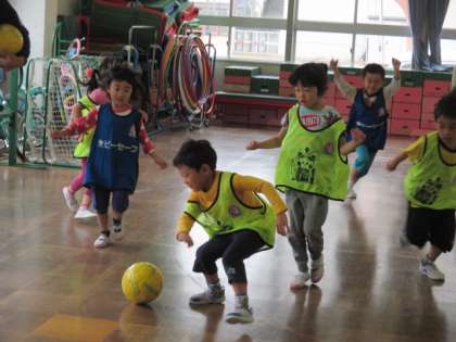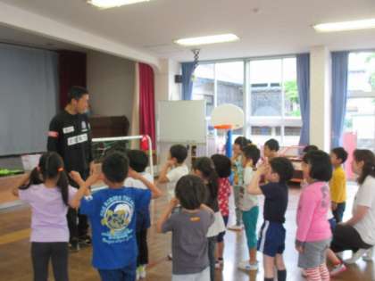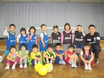 今日は、カターレのマナブコーチにサッカーボールの扱い方やドリブルの仕方を教えてもらいました。サッカー教室を楽しみにしていたので、とても張り切っていた子供たち。コーチの話をよく聞いて、よく見て真似をしながらドリブルをする姿は真剣でした。最後にゲームもしました。ボールを追いかけてシュートしたり、自らゴールキーパーになってボールが入らないようにしたりしながら楽しくサッカー教室に参加しました。