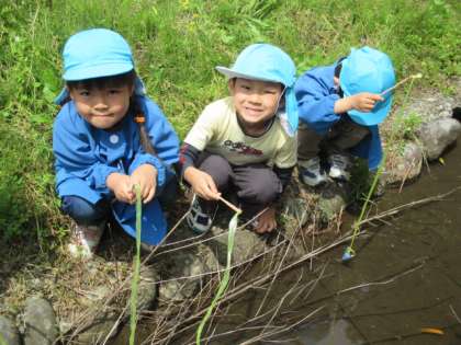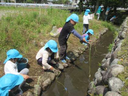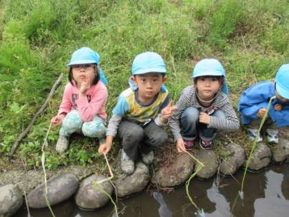 今日は、幼稚園の近くにある小川に行ってザリガニ釣りをしてきました。先週も行ってきた子供たちは、そっと小川に近づき「先生、大きいザリガニいるよ」「こっちには赤ちゃんザリガニも」と、釣り竿をもち友達と声をかけながら楽しくザリガニ釣りをしてきました。前回は、なかなか釣ることができずにいましたが、今日はコツをつかみ一人で6匹釣る子もいました。