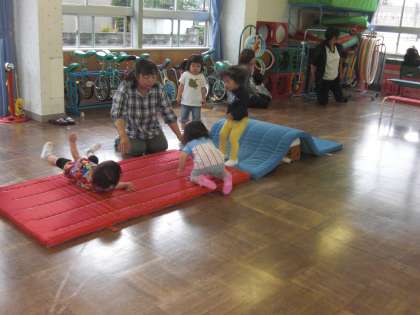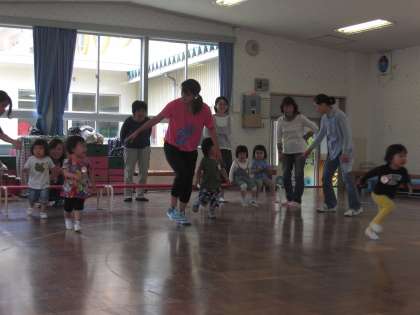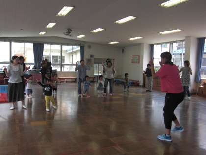 雨の中、かわいい子供たちがたくさん遊びに来てくれました。今日は、講師を招いて親子体操教室をしました。リズムに合わせて体を動かしたり、かけっこをしたりしました。お母さんやおばあちゃんが見ている中、はりきってマットで転がったり、ジャンプしたりと幼稚園で楽しく遊びました。最後に箱の中から飛び出してきたスポンジボールに驚いた様子でしたが、ボール拾いに夢中になる子供たちでした。次回は、6月9日(金)です。