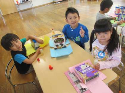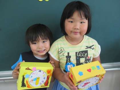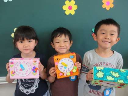 明日は、時の記念日です。子供たちは、先日「あさなのにまっくら」という紙芝居を見て「時間がわからないと大変だね」と、いう声から自分の時計を作って遊ぶことにしました。空き箱に画用紙を貼り、模様を付け、時計の1〜12の数字を自分で書いて完成させました。「短い針が3で長い針が12は、3時だよ」と、友達と遊ぶ姿も見られました。時計作りから、生活の中での時刻、時間などに関心をもってもらえたらと思います。