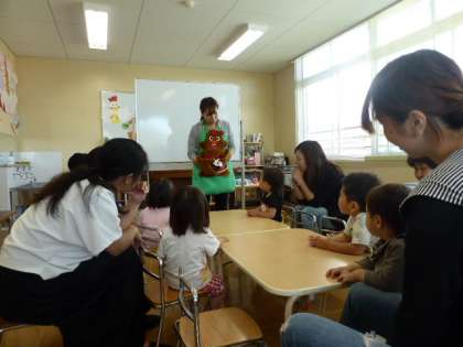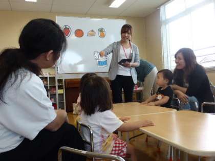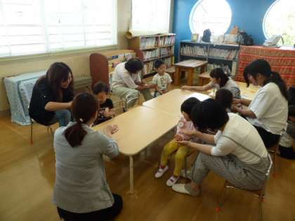 親子サークルで、かわいい子供たちが遊びに来てくれました。乳幼児の子育て講座で講師を招き、お家の人と一緒に触れ合ったり、手遊びをしたりして遊びました。言語聴覚士の先生から「乳幼児は言葉がたくさん出てくる大切な時期です。テレビを消して静かな環境で、お子さんにたくさん話しかけたり、絵本を読んであげたりしましょう」とアドバイスをしてもらいました。次回は、6月30日(金)「七夕飾りをつくろう」です。