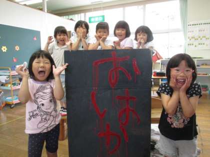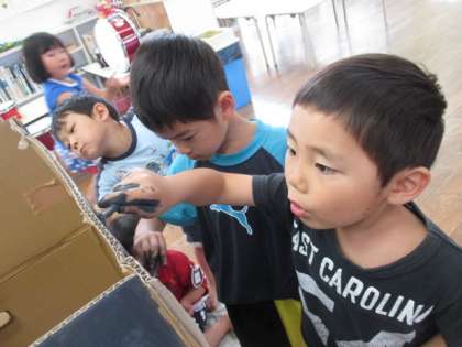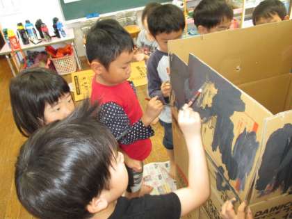 うさぎ組の子供たちは、お化け屋敷をするために遊びに必要なものを相談して作っています。絵本や図鑑を見ながら子供たちが「お化け屋敷の中にお墓があったら怖いね」と言う話しから、みんなで作ることになりました。今日は、大きな段ボールにみんなで絵の具を塗りました。子供たち同士で「ここまだ塗れてないよ」と、声をかけながら協力して作っていました。今度は、雪女、一つ目小僧などを作っていきます!お楽しみに!!