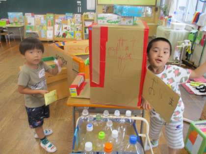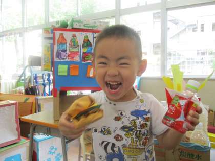 今まで作っていたおいしそうなジュースを自動販売機で売っています!お金を入れてボタンを押すと、自動販売機の後ろから人力でジュースを転がしています。たんぽぽ組さんはハサミが上手になり、紙を長く切れるようになってきたので、長いポテトをつくっています。ひまわり組さんが、チーズやトマトなどを入れたハンバーガーを作って、お店屋さんが開店しました。ダブルチーズバーガーもあります。