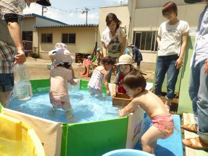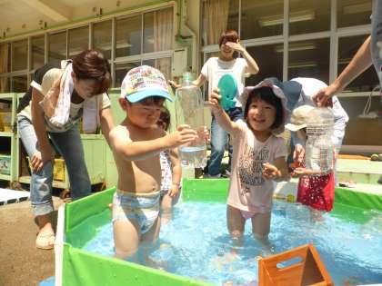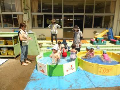 ギラギラとまぶしい日差しのもと、親子サークルで水遊びをしました。キラキラと光る水の中にとっぷりと浸かった子供たちは、ペットボトルシャワーやおもちゃで楽しみました。