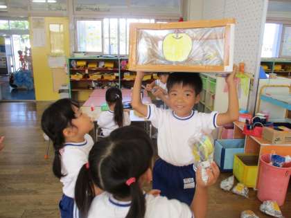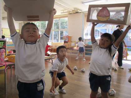 なしと栗の絵を付けた新聞紙ボールで、玉入れ遊びをしています。今日は箱を子供たちが持って、左右に揺らしたり、スクワットをして上下に動かしたりしていました。難しくなって面白さが倍増しました。