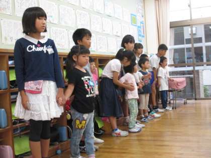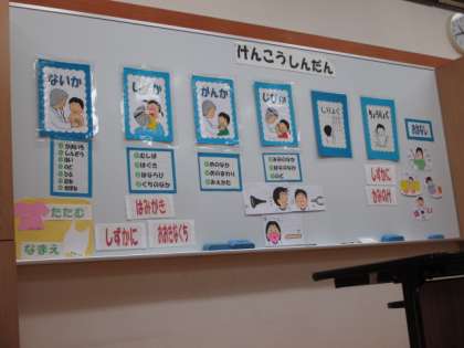 今日は、幼稚園の隣の大沢野小学校に行ってきました。保健の先生から、就学児健康診断で行う検診の内容や約束を聞いたり、5年生と一緒に、検診を行う教室や1・2・3年生の授業を見せてもらったりしてきました。初めは、緊張した様子の子供たちですが、5年生のお兄さん、お姉さんに優しく声をかけてもらうことで、緊張も和らぎ楽しく小学校を探検することができました。