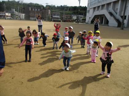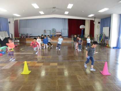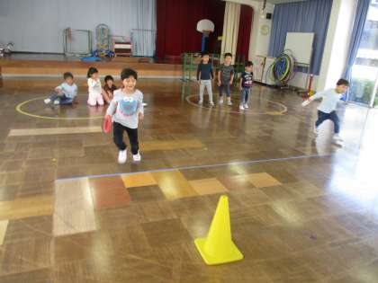 運動会のリレーで使ったバトンを見つけると、「リレーしよう」と仲間が集まった。「チームに分かれよう」「人数こっち少ないから、誰か来て」と自分たちで人数をそろえるとコーンを準備て遊んだ。「よーいどん」と声をかけたり、みんなで応援したりして子供たちだけで遊びを進めており、年長さんの姿にあこがれていたことが伝わってきました。3枚目の写真は今日の体力測定の準備体操の様子です。