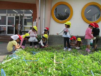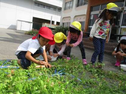 夏の間、幼稚園の玄関先に涼しげな植物カーテンだったフウセンカズラの種を収穫しました。「ハートかわいい」「種が3つずつはいっているね」「緑の中はどうなっているのかな?」など、不思議に思ったり発見をしたりしました。来年、進級した春に植えましょうね!