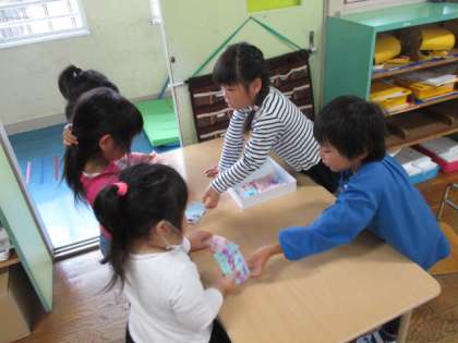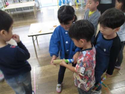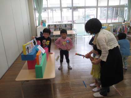 今日は、子供たちが準備をしていたスキューバーダイビングを体験できる「ラビットダイビング」と、的当てのお店を開店しました。チケットを年少、年中組の子供たちと、サークルのお友達に渡し、お客さんになって来てもらいました。小さいお友達に的当てのやり方や、ボンベや水中メガネを渡す係を楽しみながらしていました。