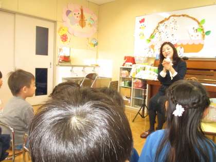 楽しみにしている荒川先生のお話の読み聞かせがありました。3・4歳児は”オバケカレー”で、5歳児は”アリババと40にんのとうぞく”でした。絵本の内容に合わせてピアノを弾きながら歌を歌ってくださって、とても素敵な会でした。