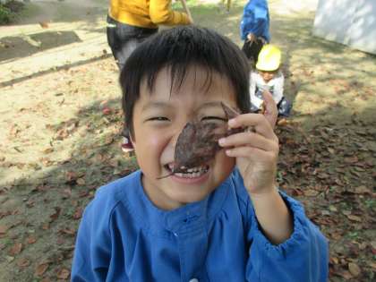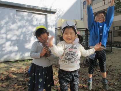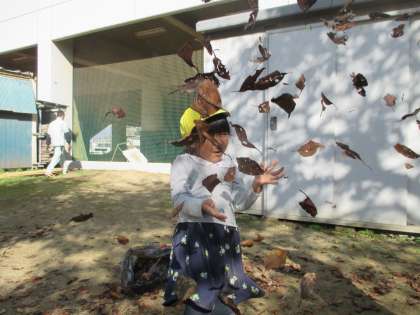 園庭の桜の葉も落ちてきて、カメのお布団用に葉っぱを集めていると、「葉っぱのお山」と言ったり「僕のお布団!」と上に登ったりしているうちに、葉っぱを空高く舞あげ「キャハハー」と大喜びでした。子供たちは遊びを見つけるのが上手ですね!