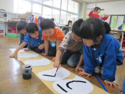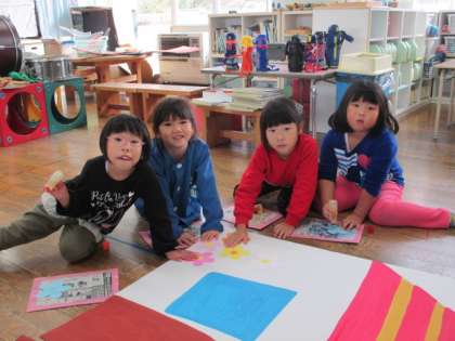 昨日に続き、今日も劇遊びに使う大道具や小道具づくりをしました。筆で文字を書いたり、背景の絵に花を飾り付けたりと、子供たちはとても楽しそうに取り組んでいました。子供たちの大好きなお話がどんどん形になってきて、みんな張り切っています!