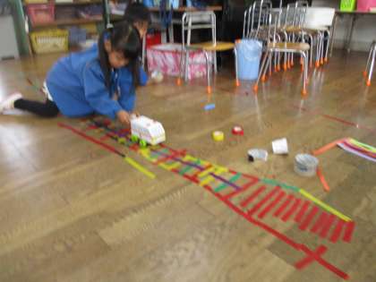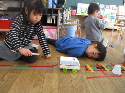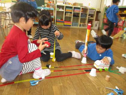 磁石が付いた車を、磁石付き棒で押しています。触れていないのに進む様子が面白いようです。