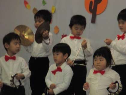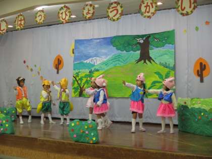 ひまわり組、たんぽぽ組は「ともだちほしいなオオカミくん」の劇をしました。3歳児の子供たちは、初めての発表会!ドキドキした表情の子もいましたが、大きな声でセリフを言って楽しんいました。