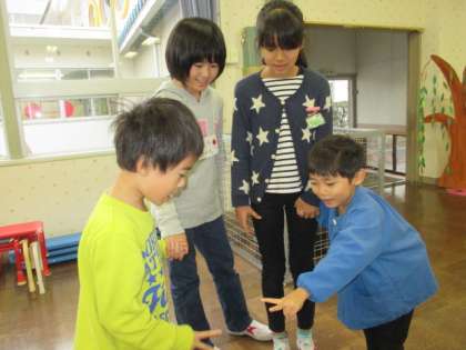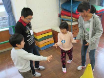 今日は大沢野小学校の5年生のお兄さんお姉さんと、第2回目の交流会をしました。最初は4グループに分かれ、陣地取りゲームをしました。お兄さんお姉さんと一緒に手をつなぎ、相手チームと出会ったところでジャンケン!勝ったらどんどん前へ進み、相手の陣地に早く入ったほうが勝ち!子供たちは勝負をかけて、真剣な表情でゲームに取り組んでいました。そのあと、それぞれのグループに分かれ、小学生が考えてきてくれたゲームでとても盛り上がっていました。子供たちもすっかり小学生と仲良くなり、とても楽しいひと時を過ごしました。
