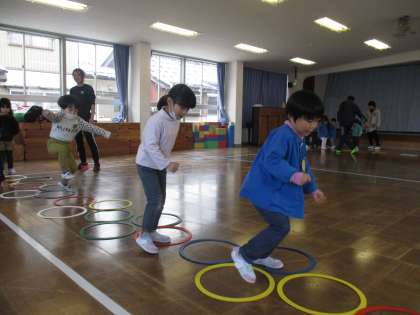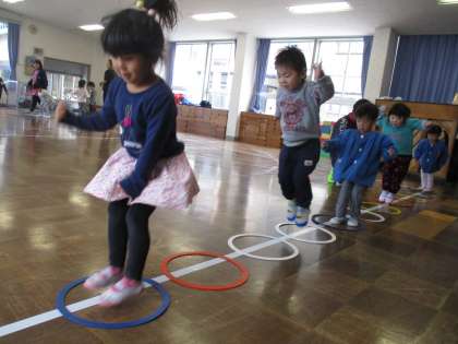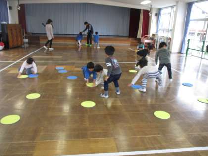 初めてのワイワイタイムがありました。先生の合図を聞いて、正座やあぐらなどのいろいろな座り方を素早くするゲームをすると、一生懸命なのですが自然に笑いが起こっていました。ケンケンパーが上手になると、赤色の印のところでは両足をそろえて飛ばなくてはならず、体を動かしながら頭もフル活動で遊びました。
