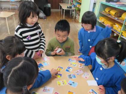 最近、文字に興味を持ち始めた子供たち。お部屋では、かるた遊びが始まりました。「ぼく読む人になる!」と読み札を頑張って読んだり、必死に絵札を探し「やったー!」と枚数を競ったりして遊んでいます。「ことわざかるた」や、「日本一周かるた」など、ことわざや都道府県にも興味をもって楽しんでいる子供たちです…