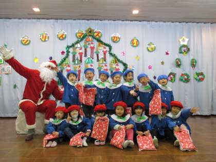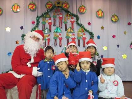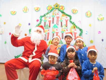 今日は、子供たちが楽しみにしていたクリスマス会をしました。鈴の音に気が付いた子供たちは「サンタさんだ」と、大喜び!!サンタさんと一緒に歌を歌ったり、フォークダンスをしたりして楽しい時間を過ごしました。