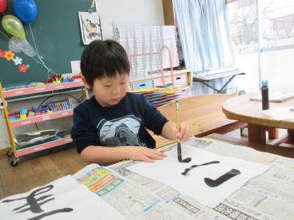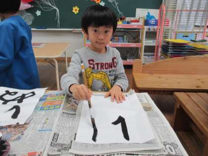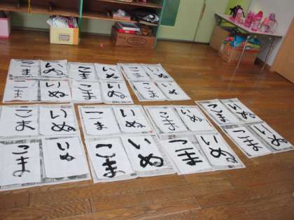 今日は書初めをしました。今年の干支は「犬」なので「いぬ」という字と、お正月にちなんで「こま」という字の2枚を書きました。墨と筆を使う経験がないので、子供たちは筆運びが難しそうでしたが、とても元気で上手な字に仕上がりました。子供たちが作ったお正月飾りに習字を貼って、廊下に掲示しますので、是非ごらんくださいね!