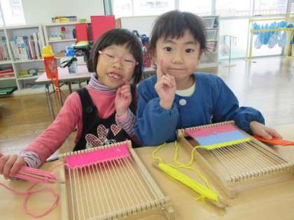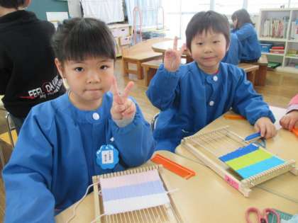うさぎ組の子供たちは、編み物に挑戦しています。編み物のやり方を知らせると「わかった」と、張り切って好きな色の毛糸を選んで編み始めました。ジグザグに何度も編まみ、根気のいる作業ですが、子供たちは「次はピンクにしよう」「何色編んだよ」と、楽しみながらつくっています。つくっている友達の様子を見て「早くつくってみたいな」「どんなのにしようかな」と、順番がくるのを楽しみにしている子供たちの姿も見られます。