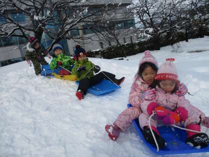 小学校の築山でソリ遊びをしました。新雪だったので初めはなかなか滑らなかったのですが、先生が滑った後を滑るうちに、だんだん圧雪されて、スピードが出るようになり、大笑いが止まらない皆でした!