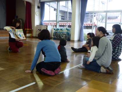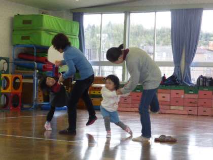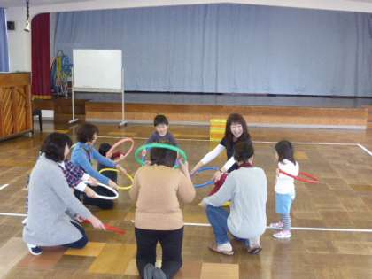 英語を使ったリズム遊びをしました。講師の先生が英語で言う動をしたり、フープを使って体を動かしたりして遊びました。遊んでいくうちに、先生に英語で尋ねられると「オッケー」と英語で答えることができた子供たちでした。英語の絵本も見せてもらいました。大沢野幼稚園では、新入園児募集中です。問い合わせは、468−2050までおかけください。お待ちしております。