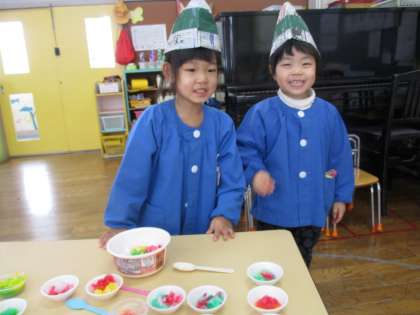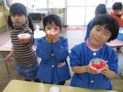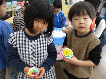 雪がずんずんと降っていて外に出れませんでしたが、室内で雪のかき氷づくりをして遊びました。イチゴ味・メロン味・バナナ味のおいしそうなかき氷ができました。全部の色を混ぜてチョコレート味やあんこをつくる子もいました。「いらっしゃいませー。おいしいかき氷はいかがですか!」お店屋さんも開店しました。
