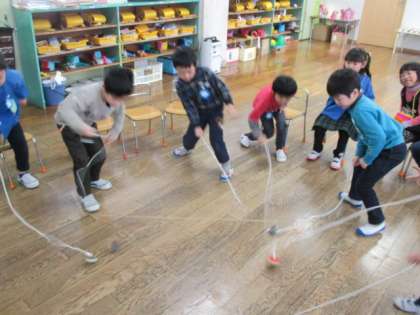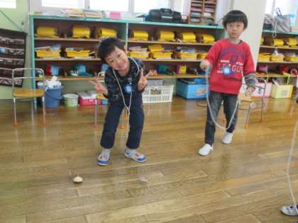 3学期に入ってからカルタ、はねつき、コマ回しなどのお正月遊びを楽しんでいる子供たち。中でもコマ回しは盛り上がっていて、毎日とてもにぎやかです。子供たちは日増しに紐を巻くのが上手になり、こまが回る時間も長くなってきました。今日はみんなでコマ回し大会をしました。「スリー!ツー!ワン!ゴー・シュー!」の掛け声で一斉にコマ回し!「やったー!ぼくがチャンピョン!」「あーもう、悔しい!」「〜ちゃん頑張れ!」と、みんなで何度も楽しみました。今日初めて回った子供もいて、大喜びでした。